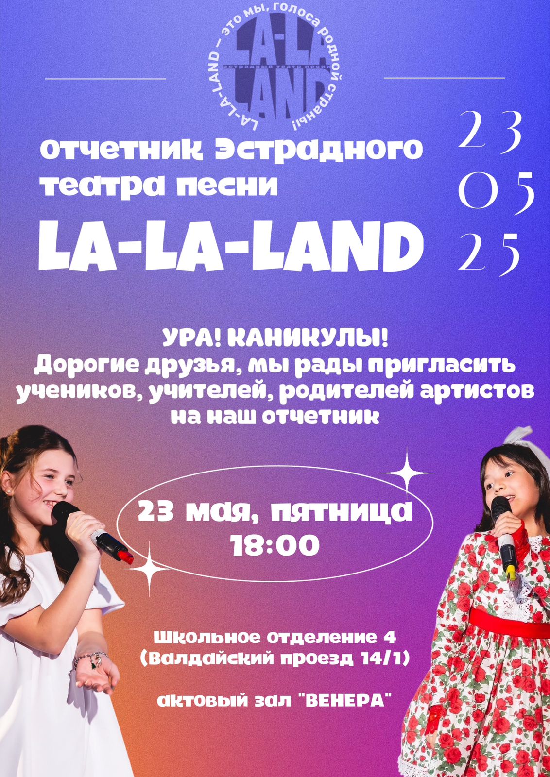 Дорогие друзья, мы рады пригласить учеников, учителей, родителей артистов на отчетное мероприятие Эстрадного театра песни «La-La-Land», который состоится