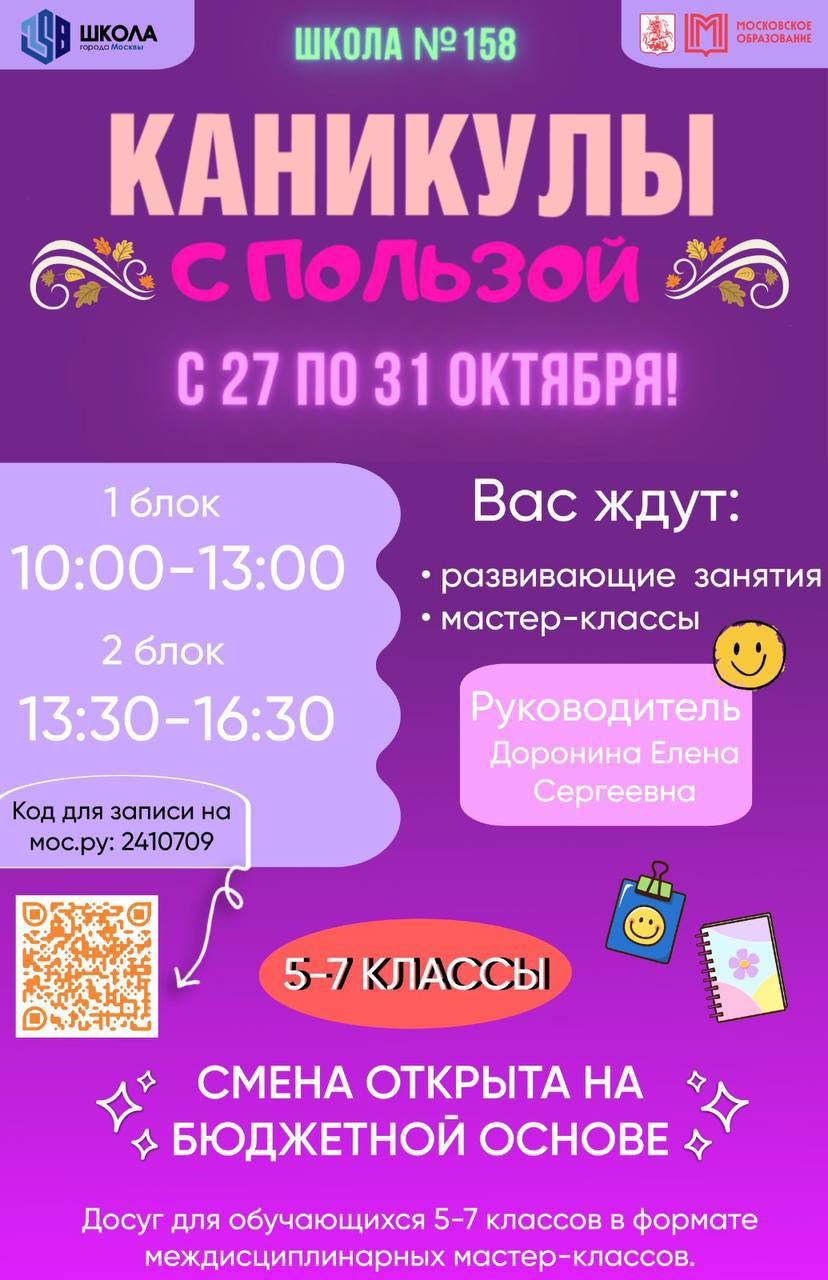 Мы приглашаем обучающихся 5-7 классов на развивающий интенсив «Каникулы с пользой 158», где они смогут раскрыть свои способности, научиться новому и весело провести время в теплой дружеской атмосфере!
